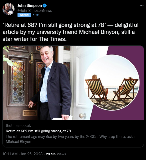 Using your well-paid position in a non-labour-intensive job to boast about working well into old age, right at a time when the UK government is announcing its plans to raise the state pension age for everyone, is at best tone deaf and at worst a weaponisation of personal privilege.
